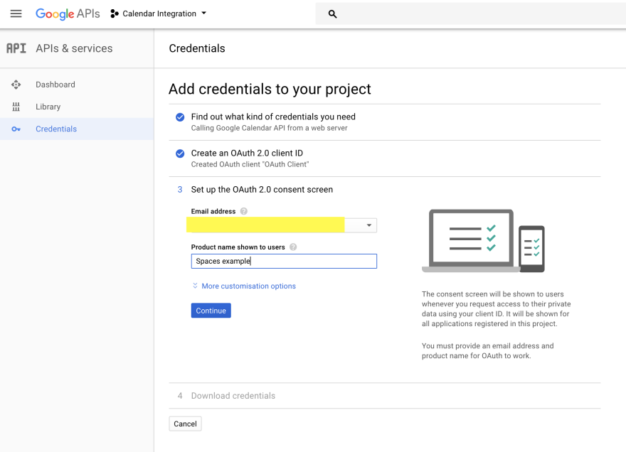 Bước thứ tư, cung cấp cho bạn client ID and credentials (thông tin đăng nhập).