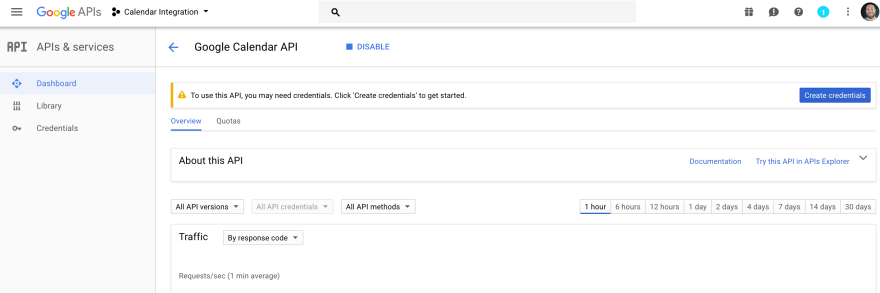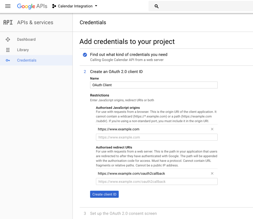 Khi dự án được thiết lập, khách hàng cần thiết lập thông tin đăng nhập để truy cập Google Calendar API thông qua dự án này.