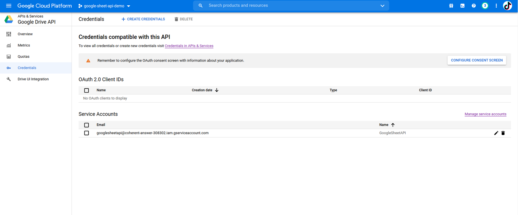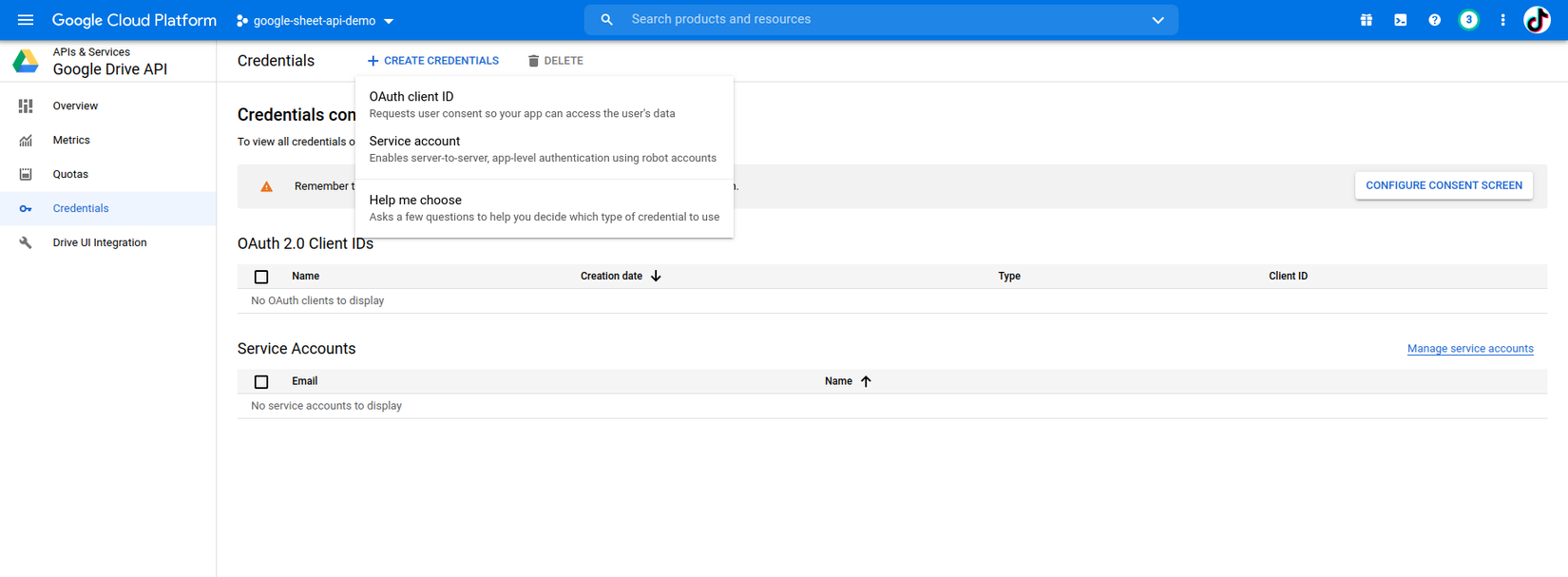 Sau khi kích hoạt xong tại màn Google Drive Api chọn Credentials -> Service account:
