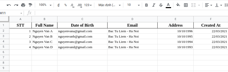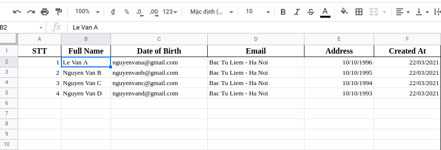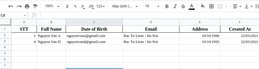 Và đây là kết quả nhận được khi chúng ta insert một User thì thông tin của User đó sẽ push lên google sheet giúp cho chúng ta quản lý dữ liệu một cách đơn giản, hiệu quả nhất.