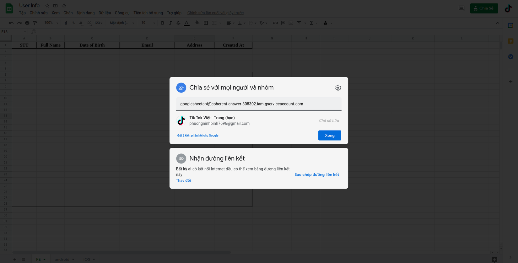 Tiếp theo các bạn tạo 1 file sheet để insert dữ liệu, các bạn nhớ là chia sẻ file này cho tài khoản service account mà chúng ta vừa tạo ở trên nhé.