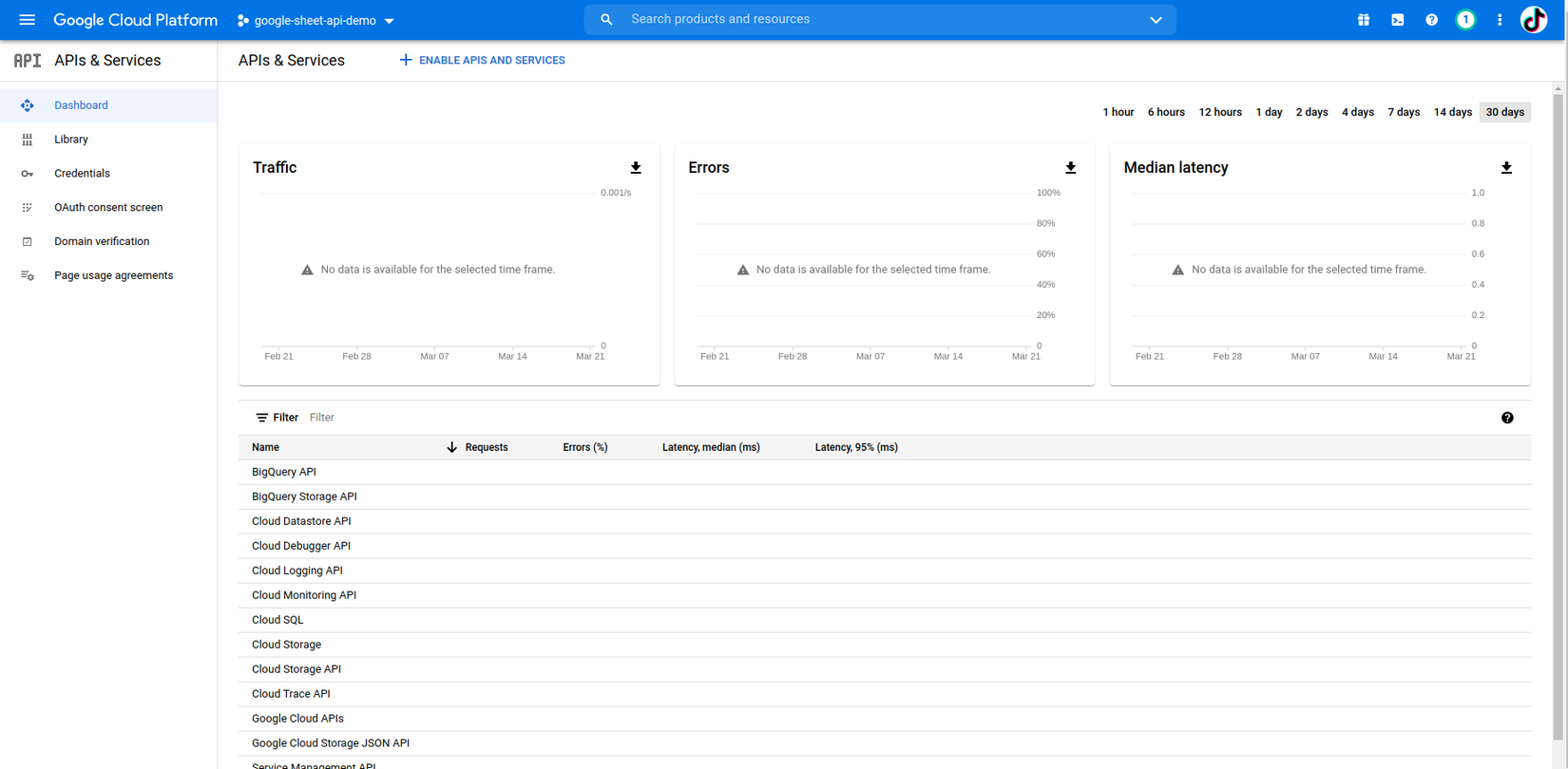 Tạo thành công thì sẽ quay về màn hình quản lý, các bạn chọn button cố dấu + ENABLE APIS AND SERVICES: