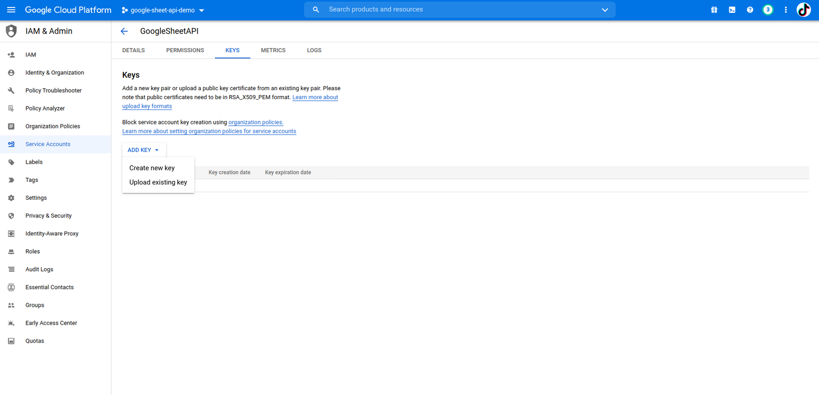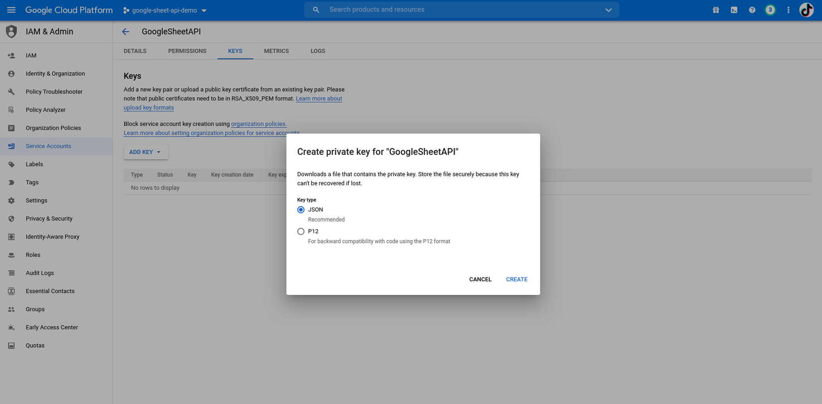Chọn ADD KEY -> Create new key -> JSON