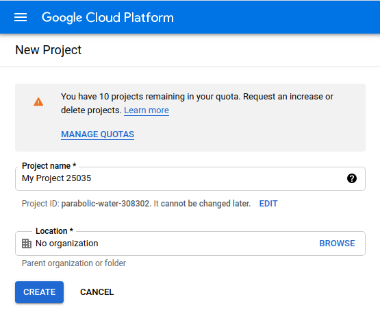 Các bạn truy cập link API & Services sẽ hiển thị link đăng ký tạo project mới, các bạn điền đầy đủ thông tin yêu cầu: