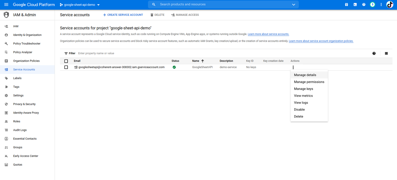 Tại đây google drive sẽ tạo ra một account tự động để ủy quyền thao tác với google sheet. Chúng ta chọn Manage service accounts