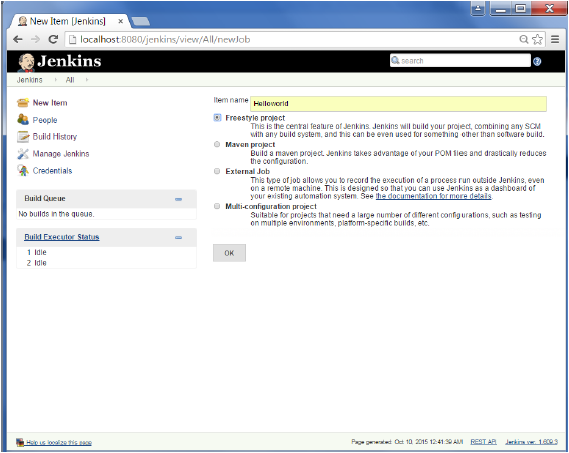 - Trong màn hình tiếp theo, nhập Item name, trong ví dụ này, tôi đã đặt tên cho nó là Helloworld. Chọn tùy chọn ‘Freestyle project’