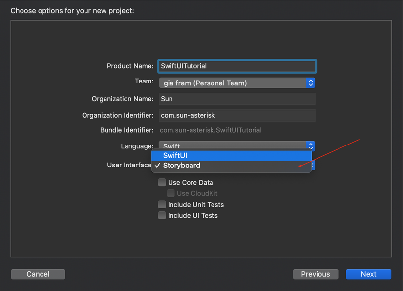 Đầu tiên, chúng ta cần tạo UIKit project trước. Để tạo project dùng UIKit thì chúng ta tạo project như mọi khi thôi. Ở bước chọn User Interface thì các bạn chọn Storyboard và tạo project -> done
