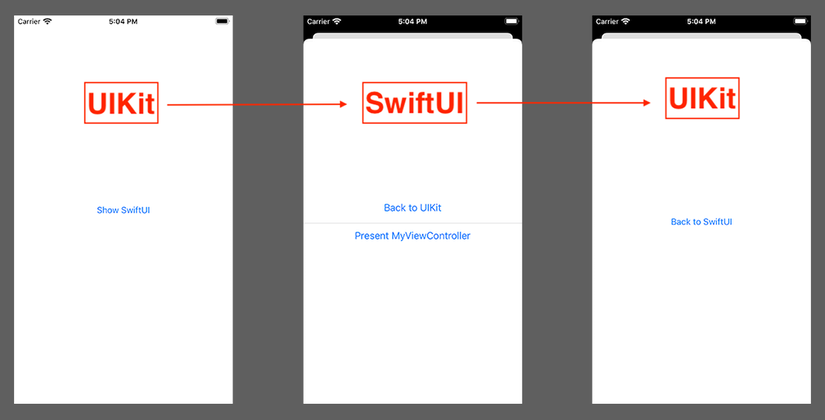 - Nhúng UIKit view vào SwiftUI project: xảy ra khi chúng ta muốn thêm thư viện/code có sẵn viết bằng UIKit vào SwiftUI project. Việc này thường xuyên xảy ra, do SwiftUI vẫn còn rất mới, nhiều thư viện vẫn chưa có phiên bản viết bằng SwiftUI, vì thế việc nhúng thư viện UIKit là bắt buộc phải làm