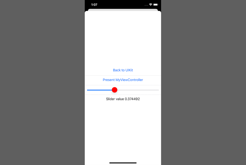 - 6, 7: Các đoạn code này cần được viết để truyền giá trị thay đổi từ UISlider về property của SwiftUI. Kết hợp với code addTarget() bên trên, mỗi khi value của UISlider được update, value sẽ được gửi trả về SwiftUI.