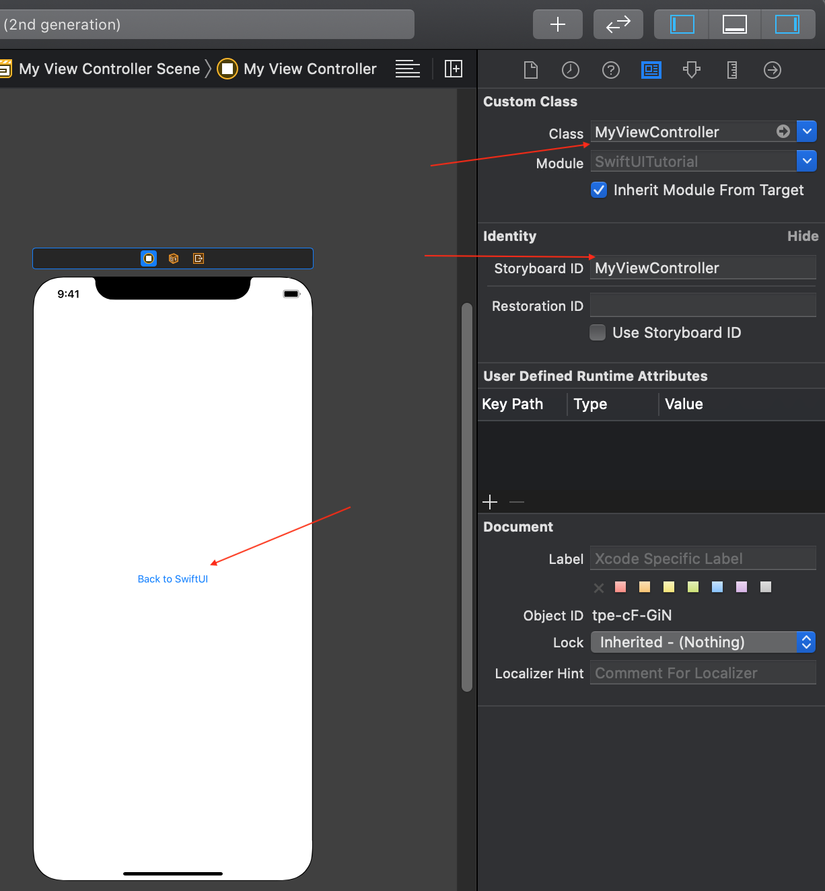 Để host UIViewController vào SwiftUI thì chúng ta lại cần nhúng UIViewController vào UIViewControllerRepresentable. Giả sử đang từ SwiftUIView, chúng ta cần present 1 UIViewController, chúng ta cần làm lần lượt những việc sau: Đầu tiên, tạo file MyViewController.swift, là subclass của UIViewController: File -> New -> File… -> Cocoa Touch Class -> UIViewController subclass -> create Tiếp Theo, vào Main.storyboard, thêm 1 ViewController. Trong Identity inspector điền Class, Storyboard ID điền MyViewController. Thêm Button với tên “Back to SwiftUI” như hình sau: