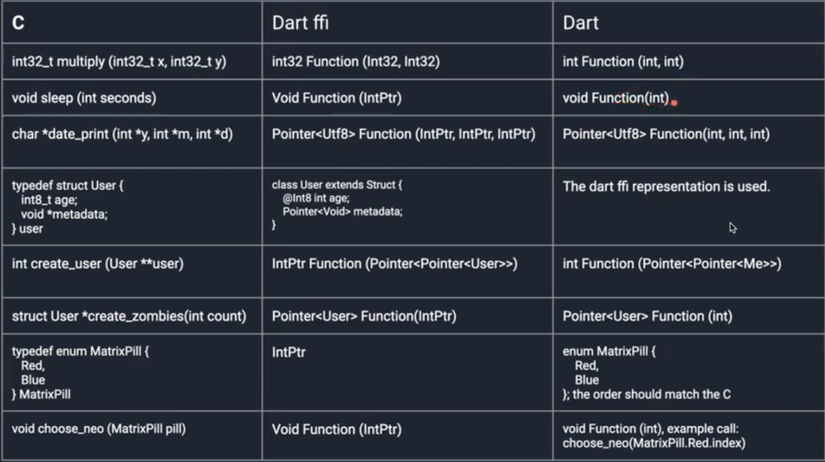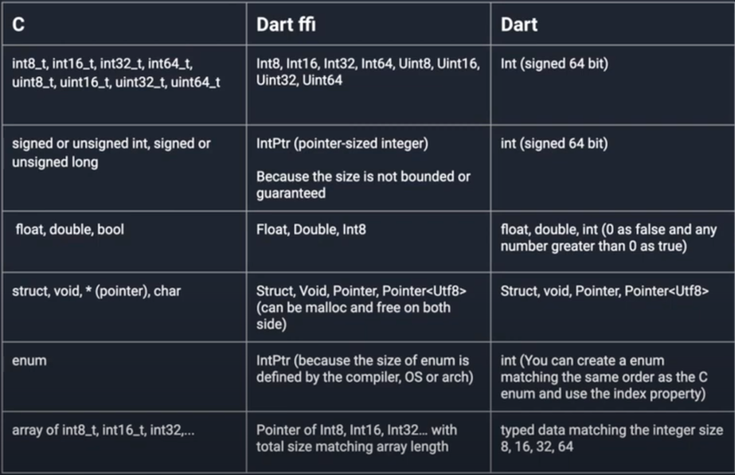 Như ta đã biết thì C có nhiều kiểu giá trị để trả về thì để ánh xạ nó đến Dart thì phải thông qua thư viện FFI như là một cầu nối giữa 2 ngôn ngữ để ánh xạ qua nhau. Dưới đây sẽ chỉ rõ cho các bạn cách để ánh xạ các kiểu giá trị với nhau.