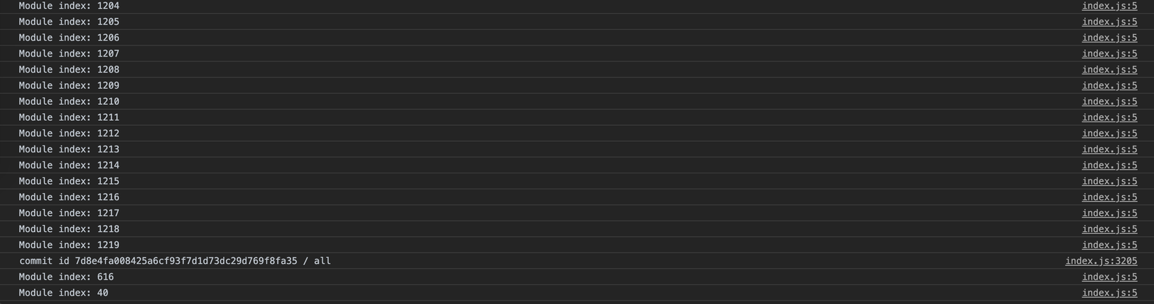 Ở đây t sẽ là object chứa toàn bộ các module, và hàm n sẽ tương đương với require. o là index của module (ở bản build development, o sẽ là tên của module, còn ở build production, o là số). Thêm dòng debug như trên ta có thể check thử: