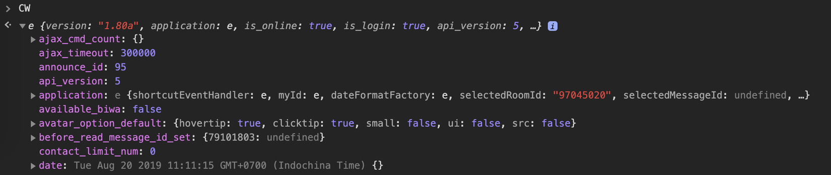 ESModulevà được load vào. Tuy nhiên, Chatwork vẫn có gán một số object global nhưCW(object chính của app ),CS,RM(object của room hiện tại mà ta đang làm việc),... gán vàowindow, điều này cho phép chúng ta thao tác được với app Chatwork từ javascript.