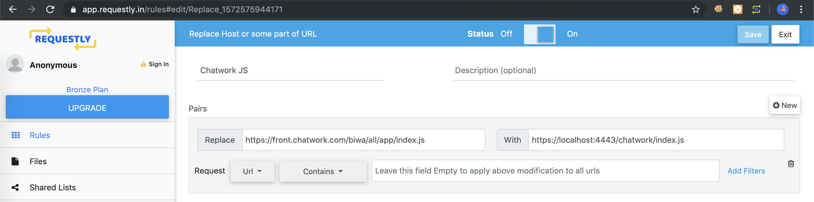 Bước này chúng ta sẽ điều hướng browser để thay vì load file js từ địa chỉ https://front.chatwork.com/biwa/all/app/index.js thì load file local, khi đó, logic chương trình vẫn sẽ hoàn toàn giống như cũ, nhưng file js giờ đã do ta quản lý, ta có thể: