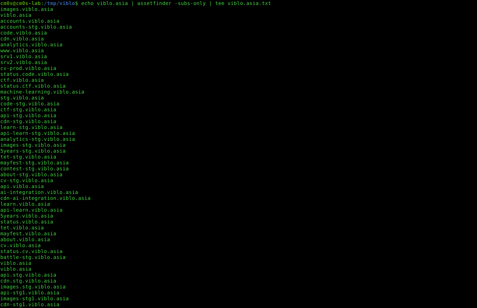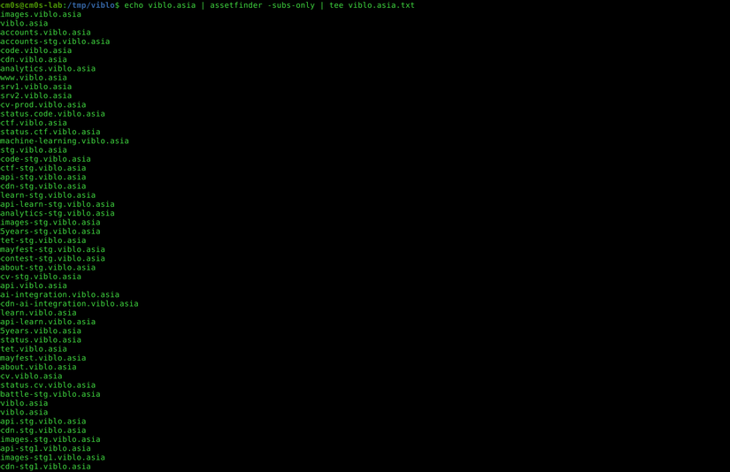 Đầu tiên mình sẽ lấy tất cả tên miền liên quan đến viblo.asia cho vào một file. Có nhiều tool hỗ trợ tìm kiếm tên miền, nhưng mình quen sử dụng assetfinder của tomnomnom. Để lấy tất cả tên miền mình chạy lệnh sau