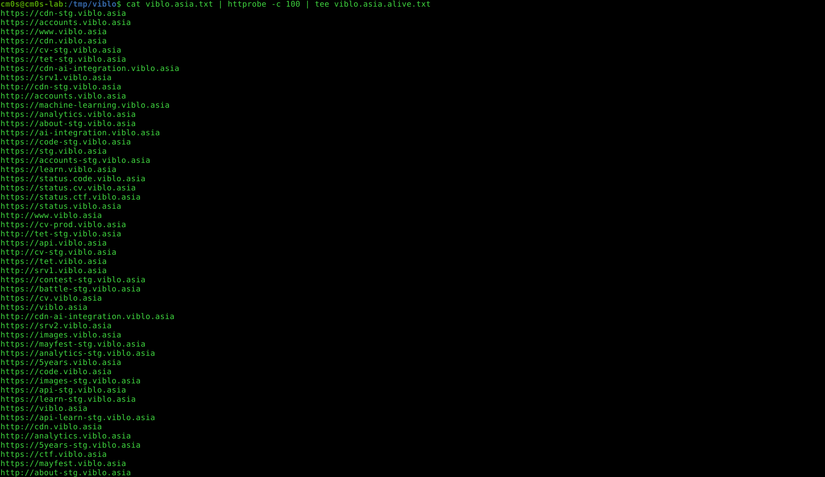 Sau khi đã có danh sách các tên miền việc tiếp theo mình làm đó là lọc ra những domain còn sống. Để làm việc này cũng có nhiều tool, mình dùng tool httprobe của tomnomnom luôn cho tiện.