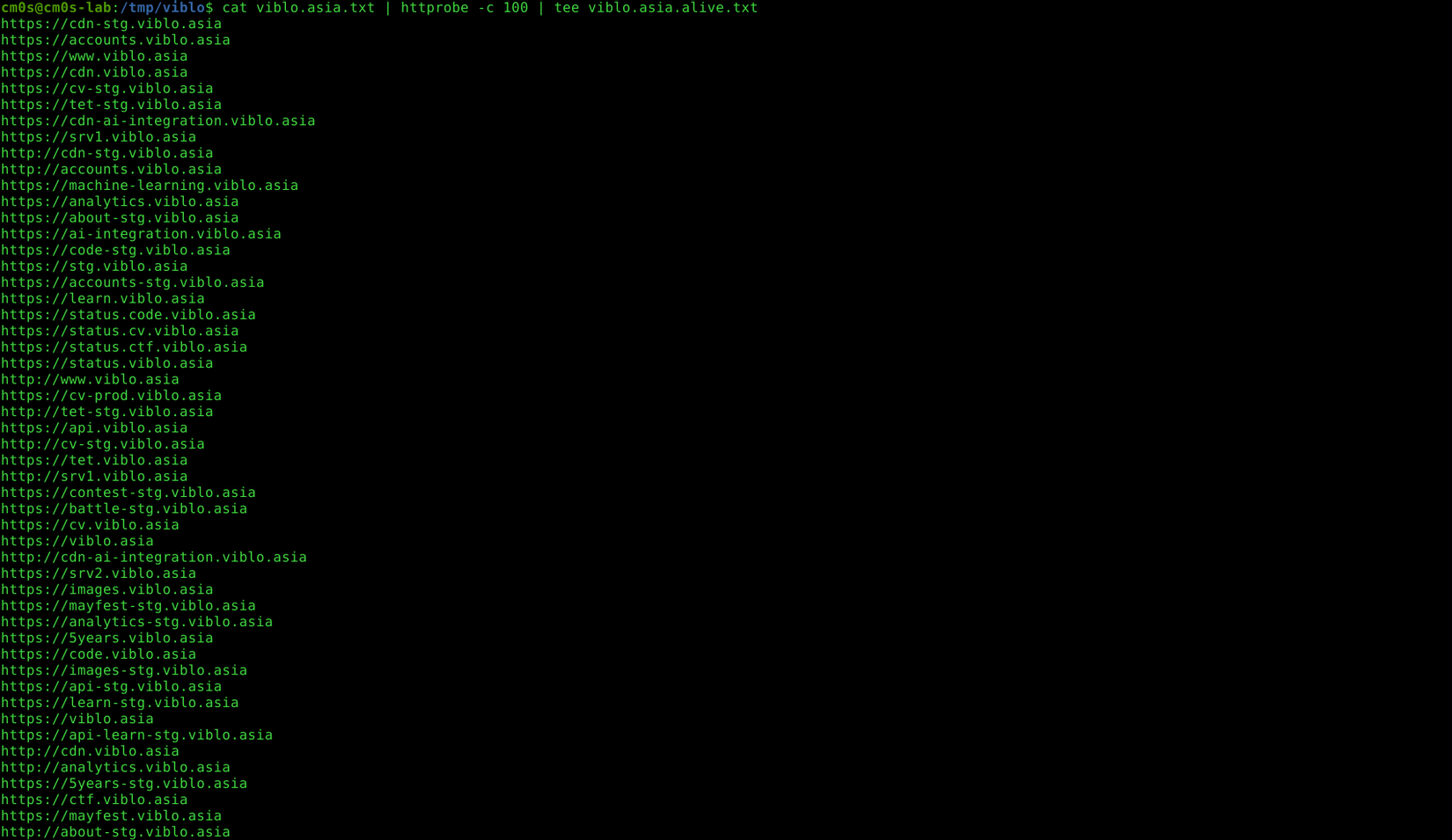 cat viblo.asia.txt | httprobe -c 100 | tee viblo.asia.alive.txt