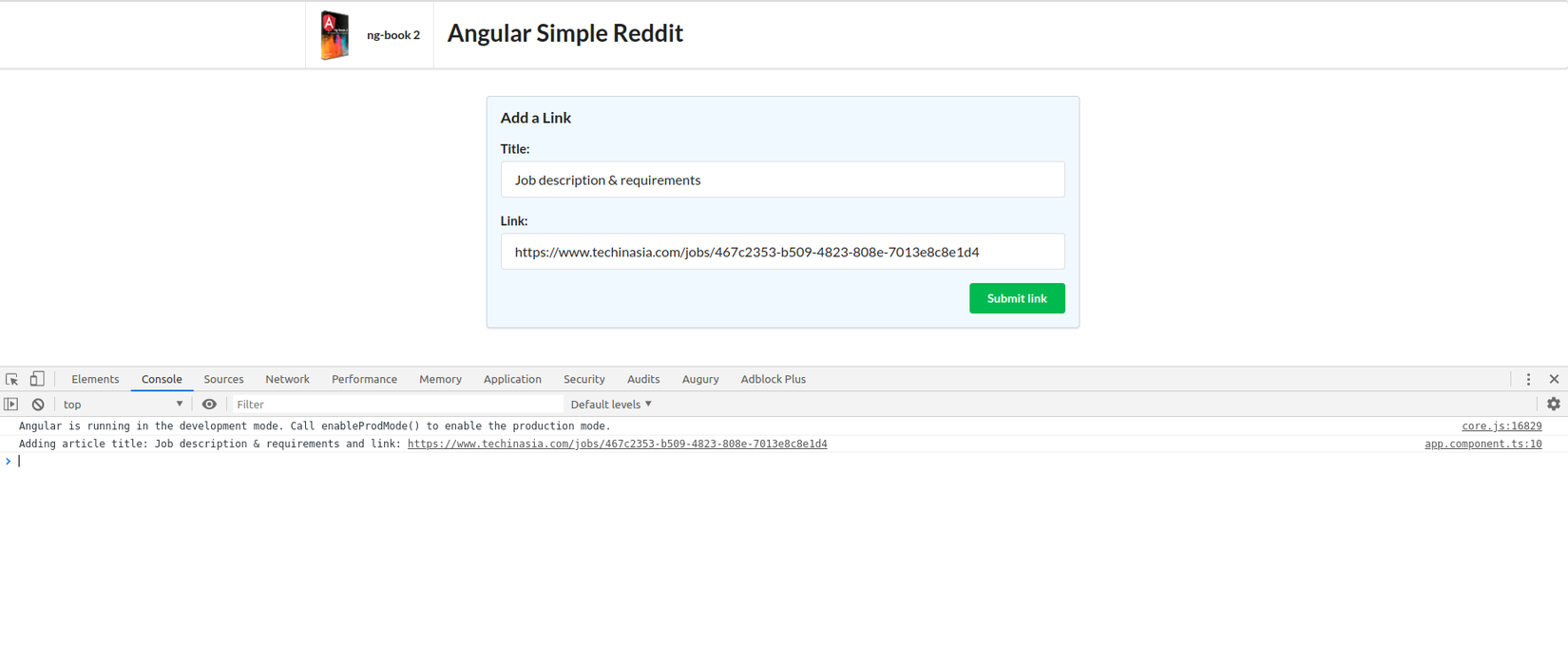 Ở trên class AppComponent chúng ta đã define một function mới là addArticle. Hàm đó có 2 đối số title và link. Cần chú ý rằng cả title và link đều là object của HTMLInputElement và không thể lấy giá trị một cách trực tiếp.