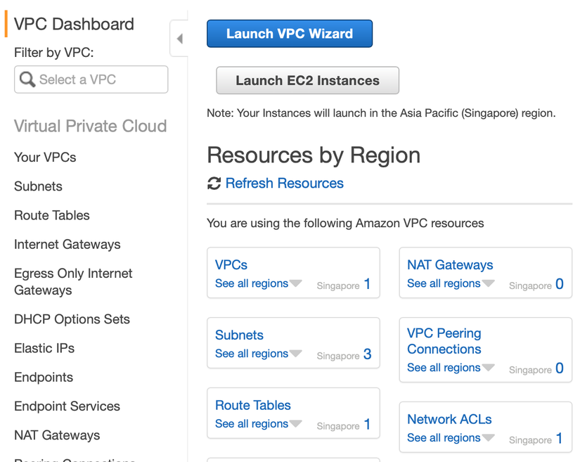 VPC đi kèm với một số thành phần hoạt động cùng nhau để cho phép kết nối mạng. Hình trên hiển thị bảng điều khiển của VPC, liệt kê các tài nguyên bạn có thể sử dụng trong VPC của mình. Chúng bao gồm Subnets, Route Tables, Internet Gateways ...
