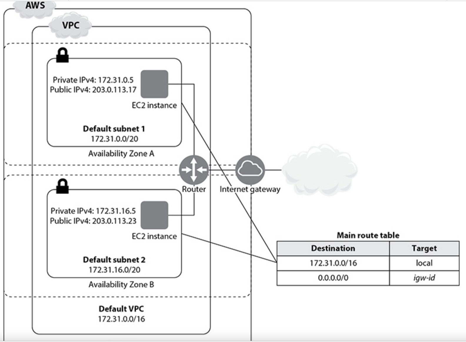 - Default subnets: Khi tạo VPC, đồng thời cũng tạo ra một subnet mặc định và là public subnet. Subnet này vừa có Private và Public IPv4. Các instances trong VPC này có thể giao tiếp với nhau và cũng có thể truy cập Internet thông qua Internet gateway. Trường hợp không sử dùng default subnet thì instances bên trong nó chỉ có private IPv5, do đó các instance này chỉ có thể giao tiếp với nhau. Nếu muốn giao tiếp với Internet thì cần chỉ định public IPv4 cho nó hoặc sửa đổi subnets' public IP