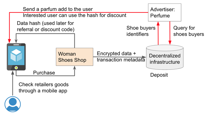 - Người dùng sử dụng ứng dụng trên điện thoại để mua hàng tại một cửa hàng giày nữ. Thông tin của giao dịch sẽ được mã hóa và lưu trên hệ thống blockchain. Data được mã hóa sẽ được gửi lại cho người dùng