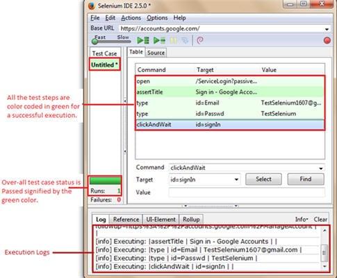Sau khi thực hiện, nếu tất cả các bước kiểm tra (dòng comand trong editor) được highlight màu xanh lục thì chứng tỏ quá trình thực thi đã thành công. Thanh progress (test case pane) sẽ hiển thị màu xanh lá cây (Runs: tăng thêm 1)