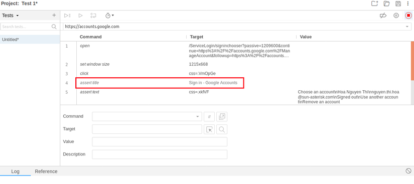 Ngay sau khi chọn mục assertTitle .... trên, 1 command (test step) bao gồm /appended sẽ được tự động thêm vào trình chỉnh sửa Selenium IDE.