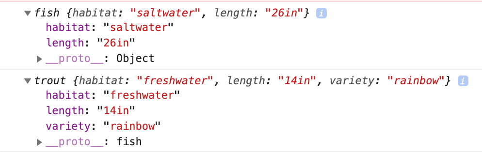 Nhờ việc sử dụng câu lệnh super(habitat,length) mà 2 thuộc tính được tạo ra trong this context của Trout. Tuy nhiên chúng ta vẫn có một cách khác để làm điều này. Chúng ta không cần phải gọi super() cùng với việc liệt kê những parameters có trong Fish. Mục đích sử dụng của super() không phải để gán cho Trout những giá trị Fish tạo ra, mà là để đảm bảo JavaScript có thể hiểu được thứ mà Trout muốn kế thừa là gì ? Vì vậy ta cũng có thể viết như sau :