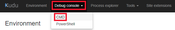 Vào Kudu console, chọn Debug console, và thực hiện CMD.