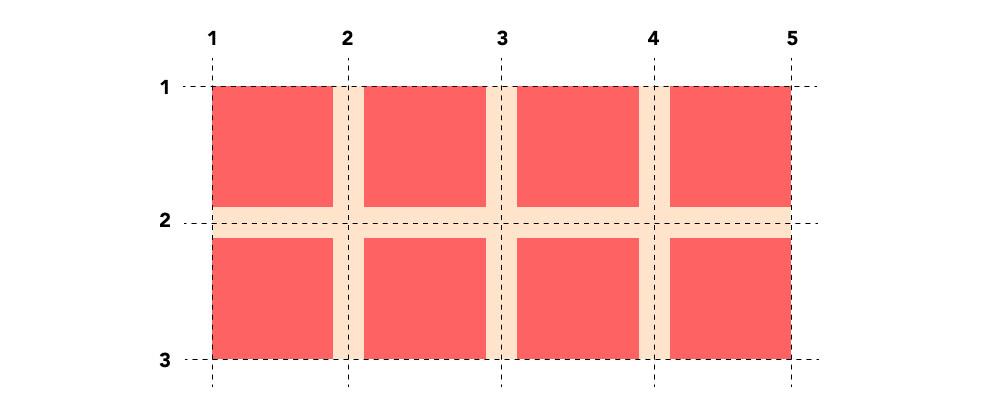 Các đường lưới là các đường dọc và ngang phân tách một lưới thành các hàng và cột. Chúng có giá trị bởi vì chúng ta có thể tham chiếu chúng để đặt rõ ràng các mục lưới bên trong một lưới. Các đường lưới được xác định bởi số lượng cột và hàng mà chúng tôi đặt rõ ràng cho lưới hoặc các cột được trình duyệt tự động đặt hoàn toàn. Trong ví dụ dưới đây, có bốn cột. Do đó, các dòng lưới cột bắt đầu từ 1 và kết thúc ở 5. Tương tự chúng ta có hai hàng, do đó các dòng lưới hàng bắt đầu từ 1 và kết thúc ở 3.