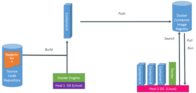 Như trong hình, một hệ thống Docker được thực thi với 3 bước chính :