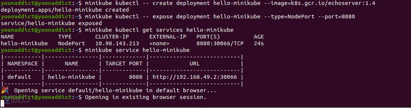 Đầu tiên bạn cần tạo một deployment và config port cho nó: minikube kubectl -- create deployment hello-minikube --image=k8s.gcr.io/echoserver:1.4 minikube kubectl -- expose deployment hello-minikube --type=NodePort --port=XXXXSau khi chạy 2 câu lệnh trên, để kiểm tra tình trạng của deployment thì phải chạy câu lệnh minikube kubectl get services. Ở đây bạn có thể thấy một số thông tin như tên/phân loại/IP/Port/Thời gian khởi tạo của deployment. ![]() Và để chạy service lên thì bạn sẽ cần chạy câu lệnh minikube service hello-minikube ![]()