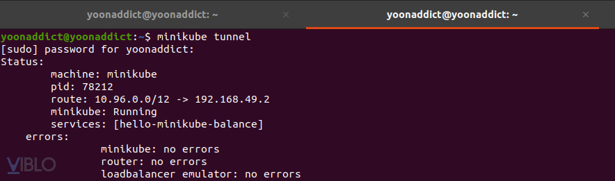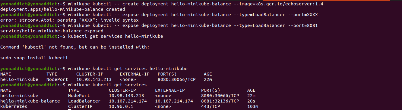 minikube kubectl -- create deployment hello-minikube-balance --image=k8s.gcr.io/echoserver:1.4 minikube kubectl -- expose deployment hello-minikube-balance --type=LoadBalancer --port=XXXX #chú ý type ở đây là LoadBalance chứ ko phải NodePort như ở trên nhé -