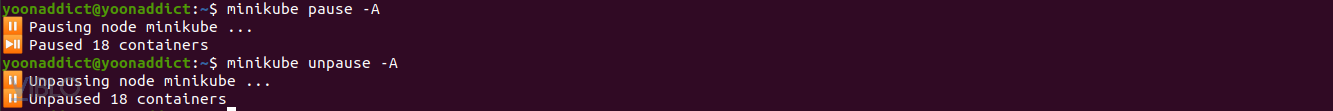 minikube pause [flags] minikube unpause [flags] # ngược với pause #list flags # -A: pause/unpause tất cả namespaces # -m: pause/unpause theo namespaces chỉ định![]()