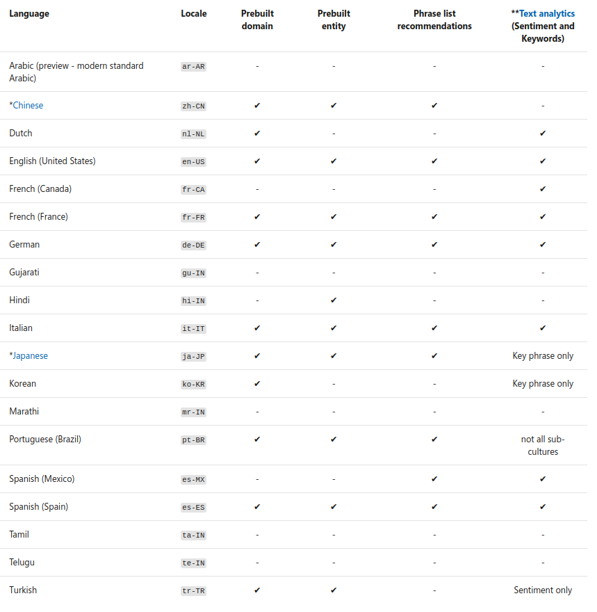 Các ngôn ngữ và khu vực LUIS hỗ trợ