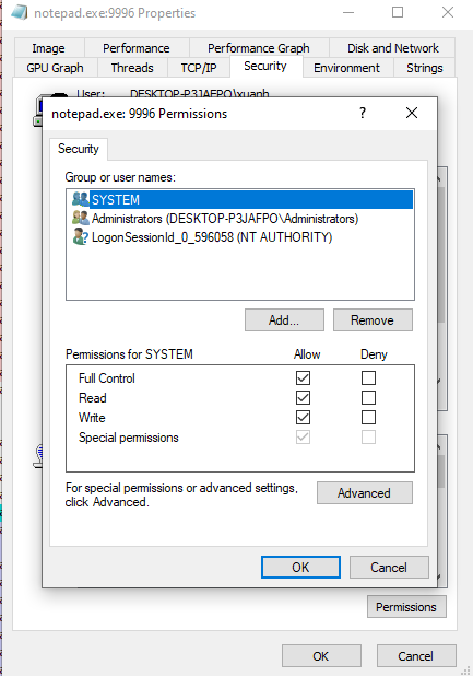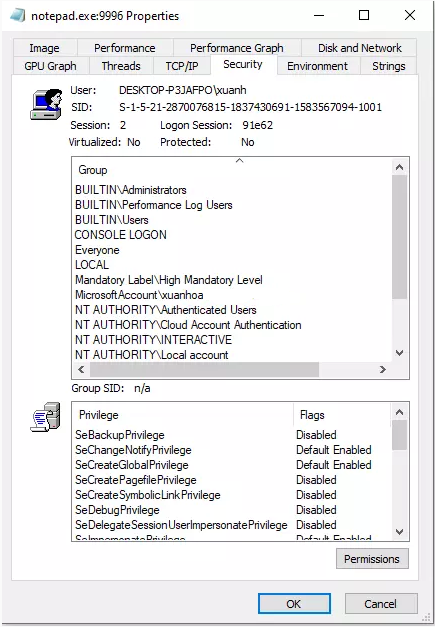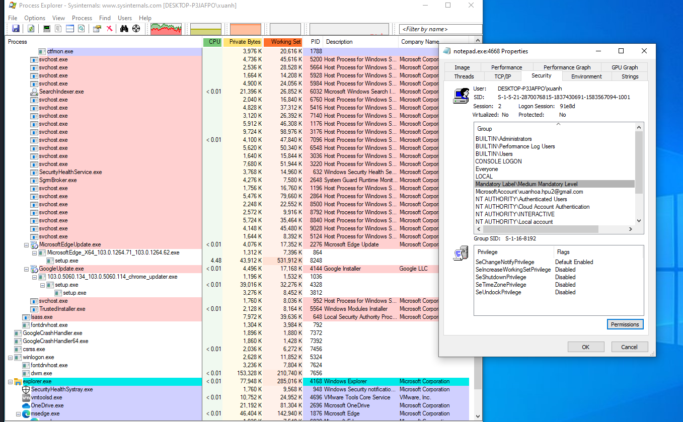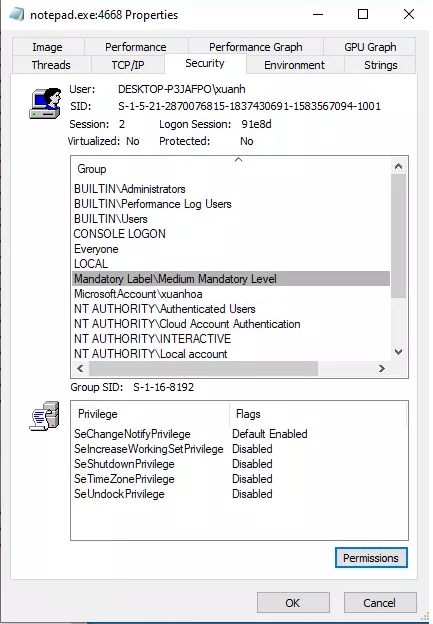Ta có thể thấy rằng, Notepad được bảo mật ở mức độ trung bình, đồng thời tài khoản user có quyền đọc và ghi với process này.