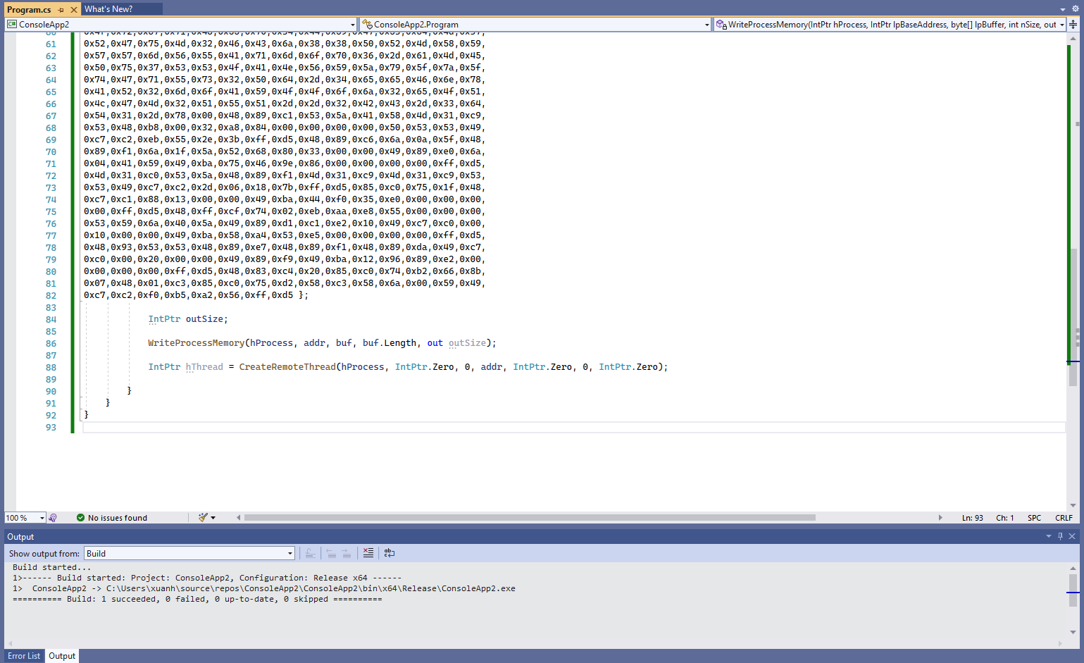 IntPtr hThread = CreateRemoteThread(hProcess, IntPtr.Zero, 0, loadLib, addr, 0, IntPtr.Zero);