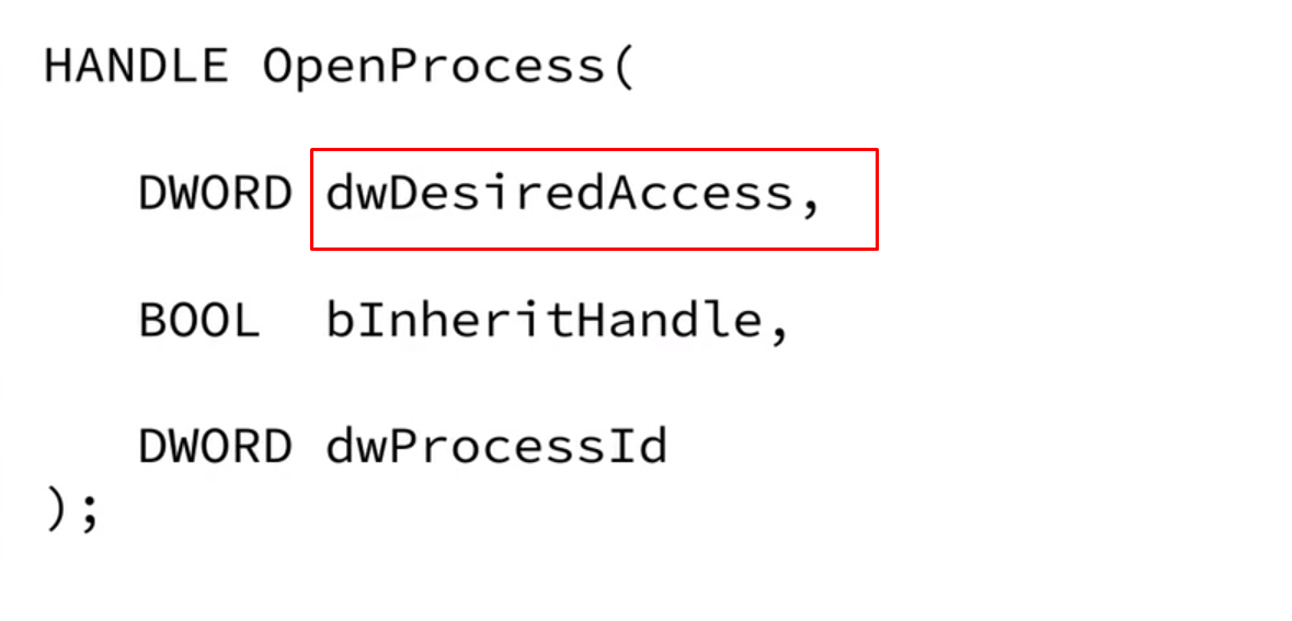 Đầu tiên, để có thể can thiệp vào một process - chúng ta cần có quyền làm điều đó với tham số check dwDesiredAccess