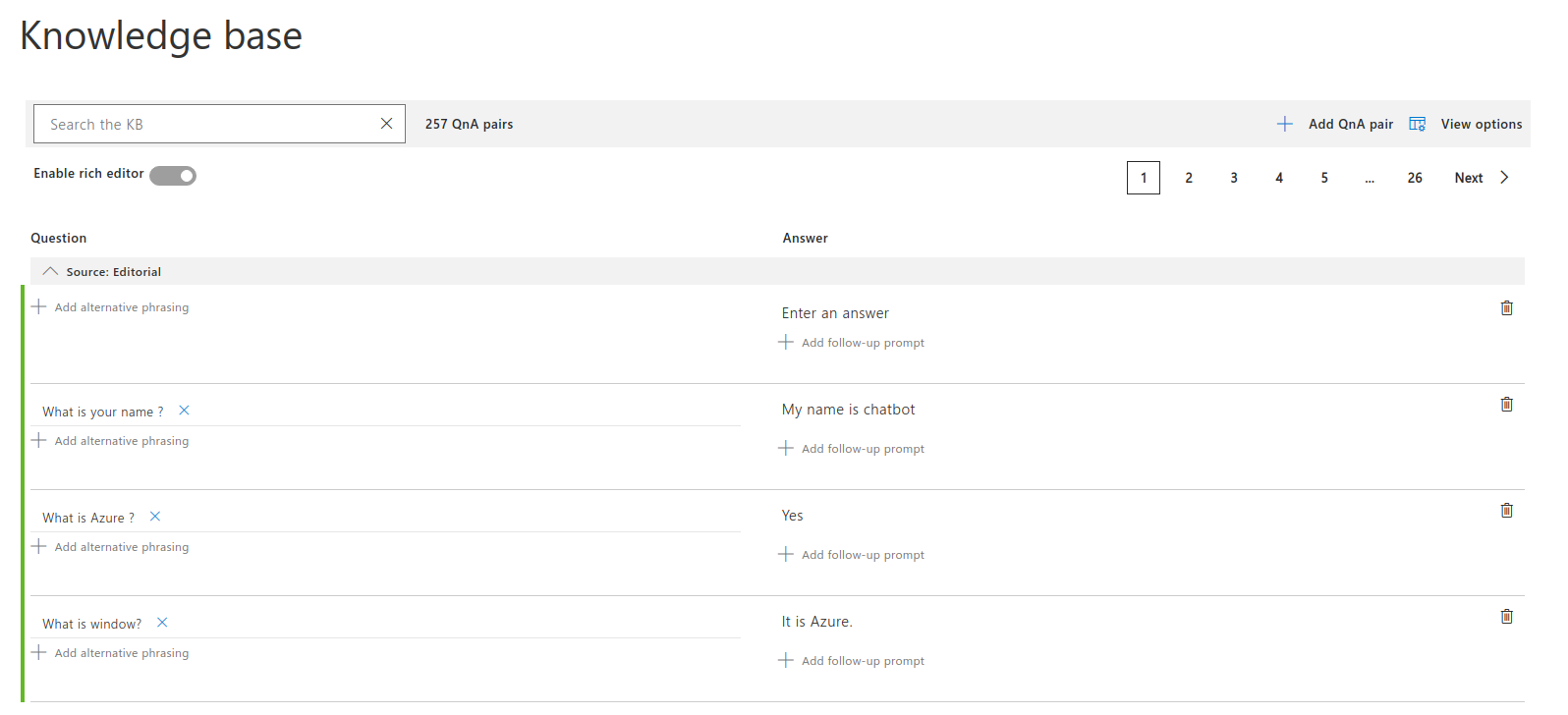 - Knowledge base là nơi để QnA Maker nhập nội dung của người dùng vào bao gồm toàn bộ câu hỏi, câu trả lời tương ứng.