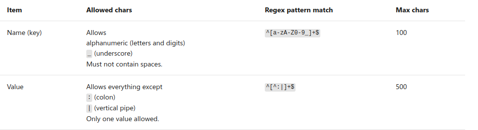 - Những ký tự được sử dụng trong metadata value: Sử dụng tất cả trừ 2 ký tự " : " và " | "