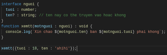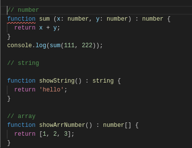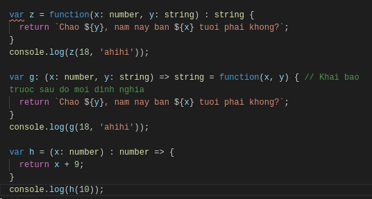 - Trong typescript các hàm đều trả về một kết quả, kết quả đó sẽ thuộc về một kiểu dữ liệu nào đó (vd: number, string, void, …).