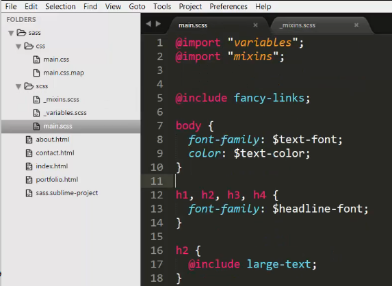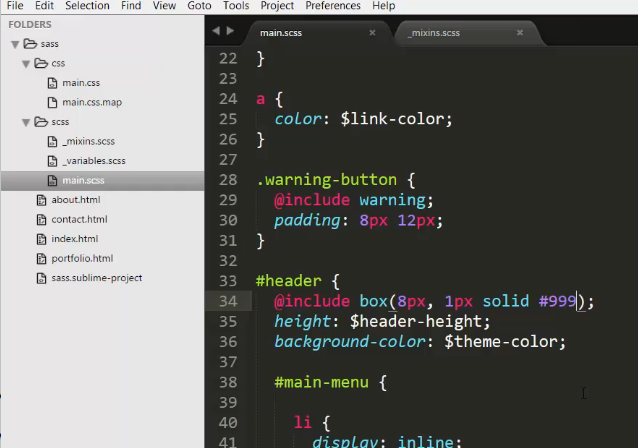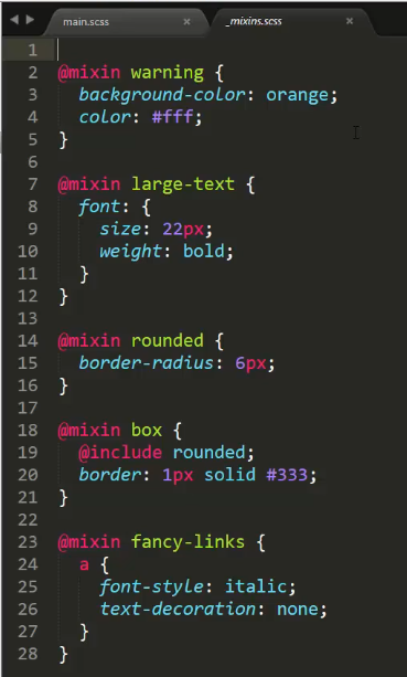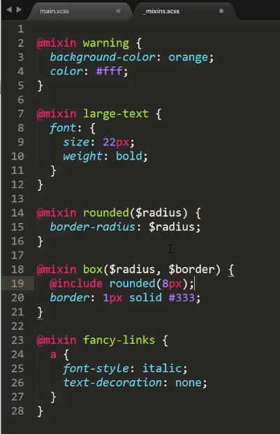 Và khi chúng ta muốn sử dụng mixin ở trong file main.scss thì chúng ta phải import file _mixins.scss vào trong file main.scss để dùng, và dùng @include tên-mixin-trong-file-_mixins.scss