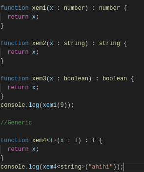 Qua ví dụ ta thấy khi hàm xem1(), xem2(), xem3() giống nhau về các xử lý chỉ khác kiểu dữ liệu trả về và kiểu dữ liệu params thay vì phải định nghĩa 3 hàm ta chỉ cần viết một hàm xem4() có thể dùng chung được cho cả trường hợp trên.
