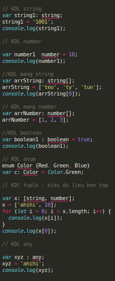 - Về bản chất của Typescript vẫn là Javascript nên các kiểu dữ liệu cơ bản của java script thì Typescript đều có ngoài ra Typescript còn có một số kiểu dữ liệu khác như là enum, tuple, any, void ...