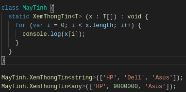 Ở ví dụ trên hàm XemThongTin() có tham số truyền vào là một mảng có kiểu dữ liệu là generic. Khi ta gọi hàm XemThongTin() ta phải chỉ ra kiểu dữ liệu T là gì trong trường hợp này là string thì khi ta truyền tham số vào cũng phải mà một mảng string nếu chương trình sẽ bị lỗi. Như đôi khi bạn muốn kiểu dữ liệu T kia không phải là string mà thay vào đó là một kiểu dữ liệu nào đó như any chẳng hạn chả nhẽ lúc này bạn lại phải viết thêm một hàm mới trong khi code xử lý như nhau, nhìn vào ví dụ ta thấy nhờ có generic thì mọi chuyện dễ dàng hơn bạn chỉ cần định nghĩa nó là kiểu any và tham số truyền vào là một mảng kiểu any là được.