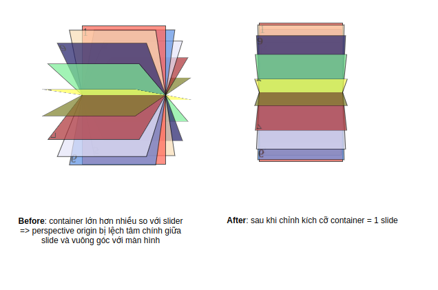 . Tuy nhiên là hiện tại hình như nó đang hướng mặt sang bên trái. Do chúng ta không set perspective-origin và xác định chiều không gian 3d cho perspective, mặc định thì perspective origin nằm ở điểm tâm của container, nhưng container đang quá lớn nên tâm hội tụ này không nằm trên trục chính giữa của slide. Hay hiểu đơn giản là khi bạn đặt máy ảnh lệch so với hộp vuông sẽ chụp được cả mặt nghiêng của hộp, còn nếu hướng camera vuông góc với 1 mặt, nằm trên đường thẳng tâm mặt Z thì chỉ chụp được 1 mặt vuông.