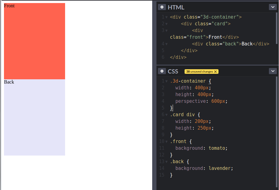 Giờ 2 mặt lá bài đã được đặt trong không gian 3 chiều, tuy nhiên hiện tại chưa có css gì để xác định hình dạng cho nó nên thêm 1 chút css nữa. Trước hết là mình vẽ mỗi mặt lá bài có chiều rộng 200px, cao 250px, mỗi mặt có 1 màu: