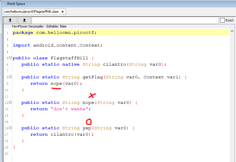 Tất nhiên cũng không thể tìm mà không có hướng gì cả. Các file code chính của ứng dụng thường nằm trong đường dẫn dạng com/abc/xyz/. Với bài này thì chúng ta thấy 1 file có cái tên đáng ngờ nằm tại com/hellocmu/picoctf/FlagstaffHill.class
