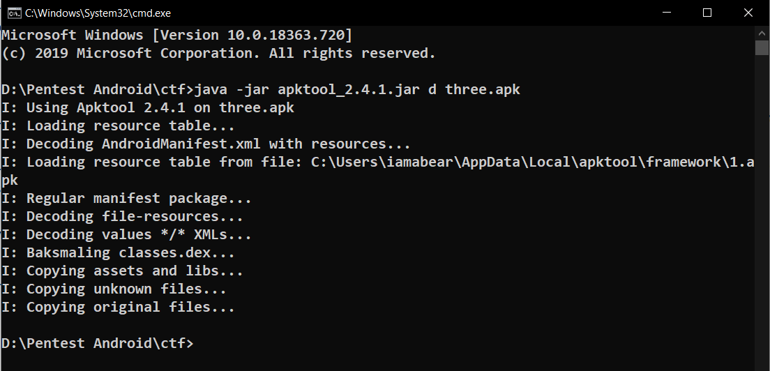 Để file apk và apktool cùng thư mục và chạy lệnh: java -jar apktool_2.4.1.jar d three.apk