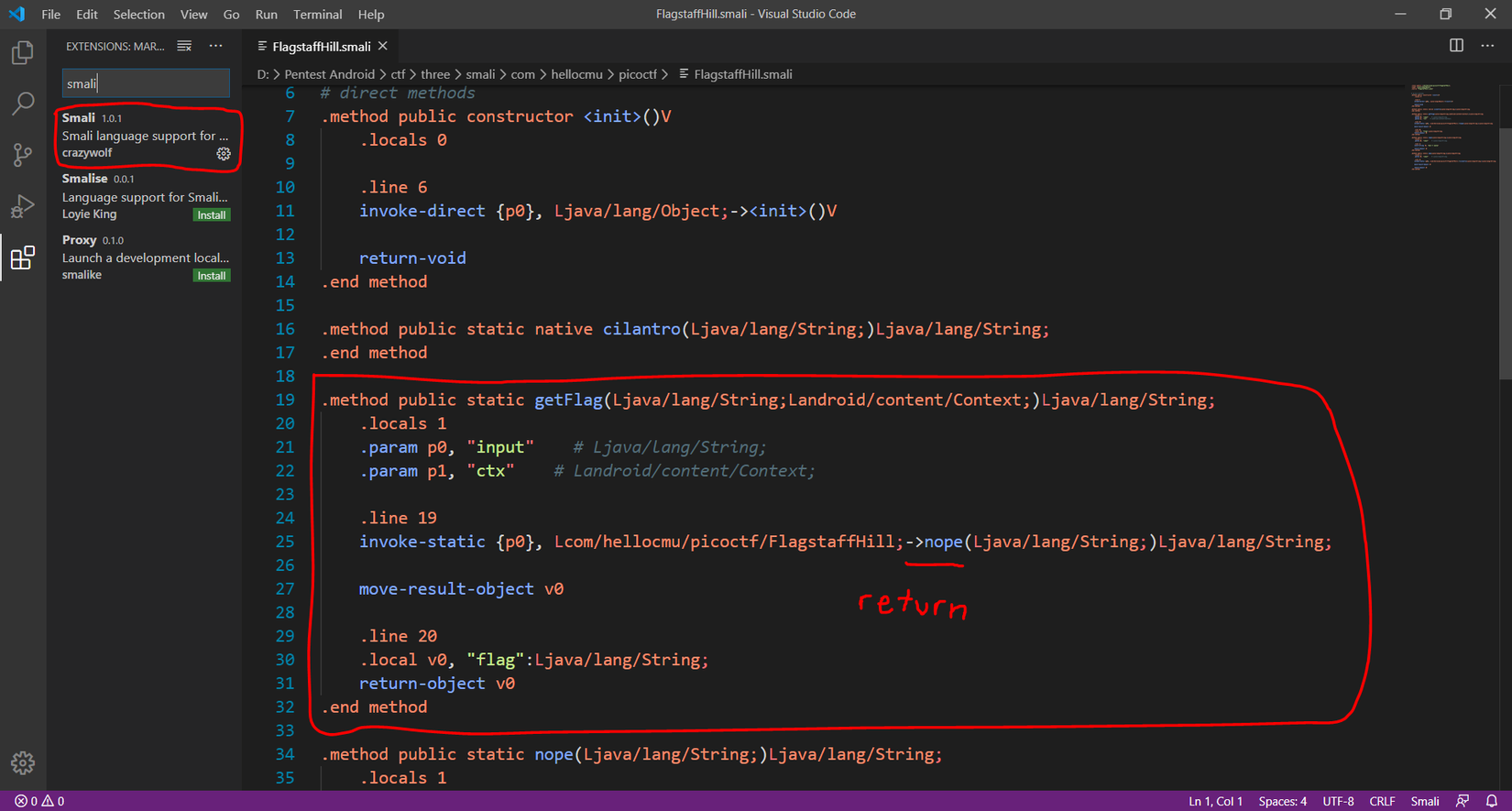 Mình sử dụng VScode cài thêm extension smali để dễ nhìn hơn, tiện cho việc sửa code.